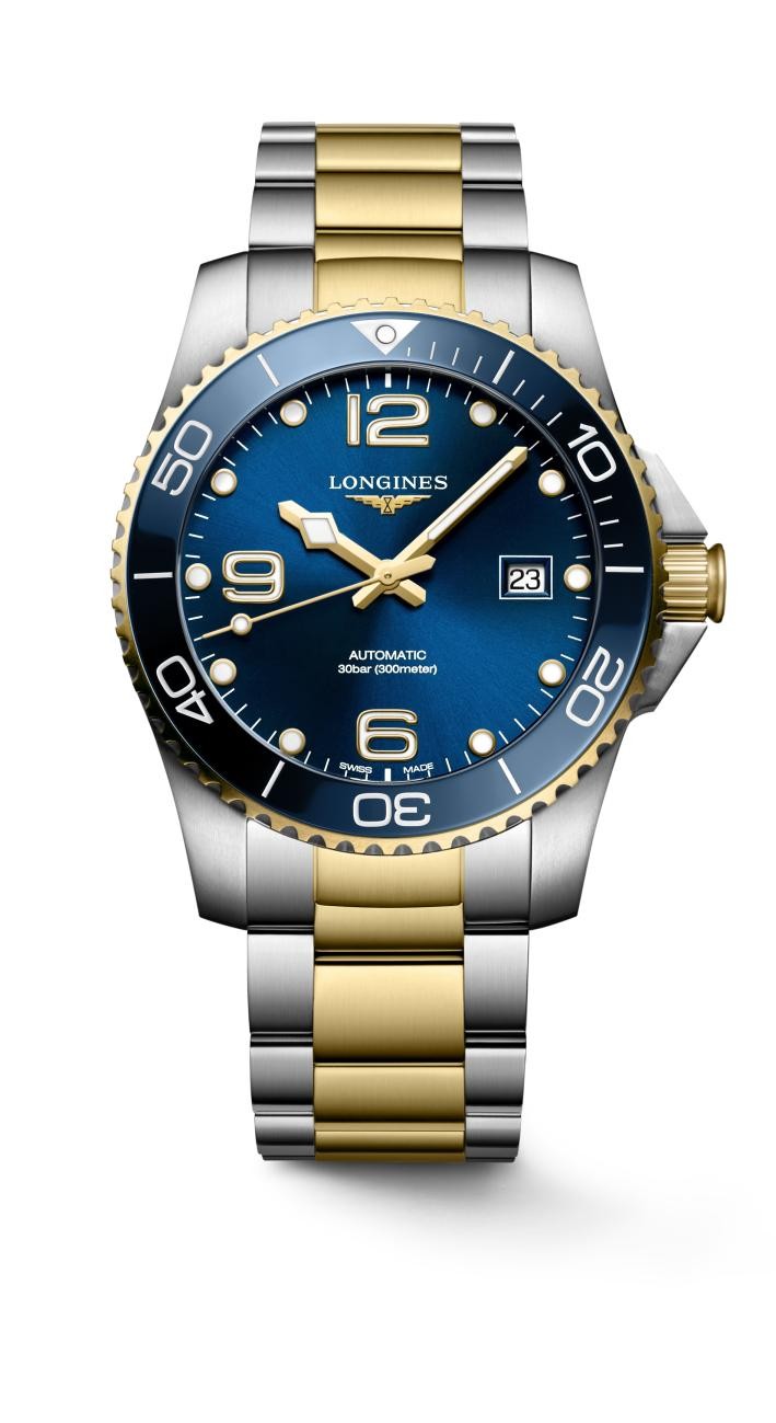 潜水表近年来是各品牌的主力,浪琴表(Longines)热卖的HydroConquest深海征服者腕表新增双色款,推出不锈钢搭黄金PVD表款搭配蓝色面盘,依然保有此系列招牌特色如300米防水、单向旋转表圈、旋入式表冠与底盖,以及搭载整合式潜水延伸设计的双重安全折叠扣。