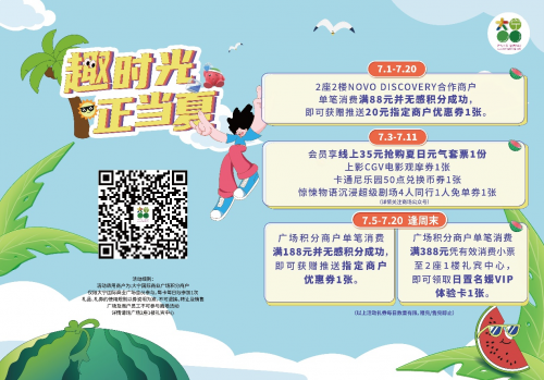 满足视听盛宴的同时,也不能辜负了吃喝玩乐。大宁国际搭配了缤纷促销礼遇,让你不虚此行。7月1日-7月20日,2座2楼NOVO DISCOVERY合作商户单笔消费满88元并无感积分成功,即可获赠推送20元指定商户优惠券1张。7月5日-7月20日逢周末,广场积分商户单笔消费满188元并无感积分成功即可获赠推送指定商户优惠券1张;广场积分商户单笔消费满388元凭有效消费小票至2座1楼礼宾中心,即可领取日置名媛VIP体验卡1张。(以上活动礼券均数量有限,赠完即止)