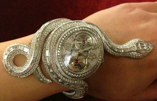 作为蛇形腕表的顶级品牌之一,宝格丽的 Serpenti 系列早已成为奢侈制表业的传奇符号。宝格丽便以古罗马神话中蛇的重生寓意为灵感,将灵蛇的优雅与腕表的功能性完美融合。其标志性的螺旋形表链如同蛇身般紧密缠绕手腕,18K 金的温润光泽与宝石镶嵌的蛇眼(祖母绿、红宝石或钻石)碰撞出致命诱惑,表盘巧妙隐藏于蛇头之中,仿佛时间在神秘的凝视下静静流淌。从伊丽莎白・泰勒佩戴的古董款到现代的 Serpenti Seduttori 鎏光蛇影系列,宝格丽始终坚守 “形神兼备” 的设计哲学,让灵蛇成为永恒的奢华象征。