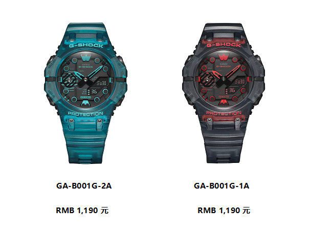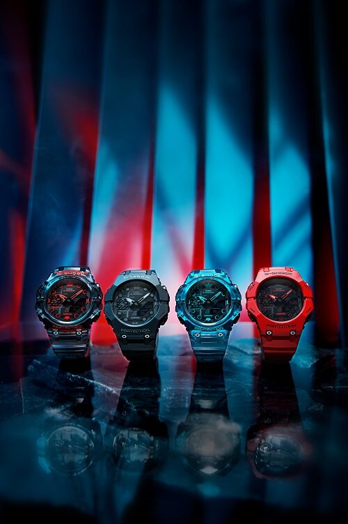 以视觉解码潮流,全新GA-B001系列在配色上也别具未来感。GA-B001-4A与GA-B001-1A采用新款红色与酷炫全黑,高饱和度带来强大视觉冲击力。GA-B001G-1A与GA-B001G-2A则采用半透明材料结合渐变喷墨印刷技术,呈现出渐变黑红与绿松石蓝,象征着以音浪,连接虚拟与现实世界。个性前卫,营造非凡视觉感官。