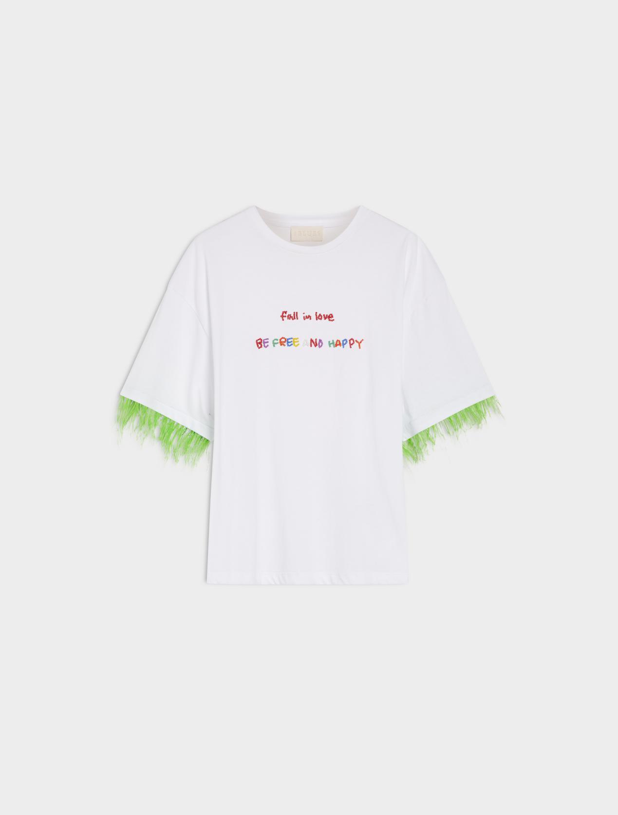 同系列还搭配了俏皮活泼的运动风单品,超短款和常规款的 T 恤任意选择。短款复古童趣印花短袖结合鲜明高饱和度色彩,搭配高腰裤或百褶裙更增添可爱氛围,是属于辣妹的夏日秘籍。白色短袖以草绿色的流苏边装饰袖口,结合彩色字母印花,简约中不失细节,为日常注入自由音色。